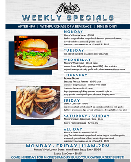 Mickie's Pub does take out orders (specials excluded), you may view our full menu online or download a printable copy of our menu for offline ordering.
